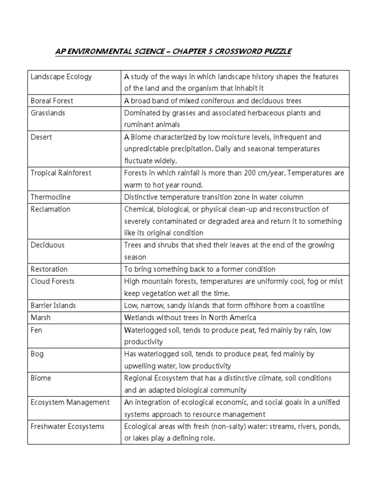 Ap Environmental Science Chapter 5 Crossword Puzzle Wetland Forests